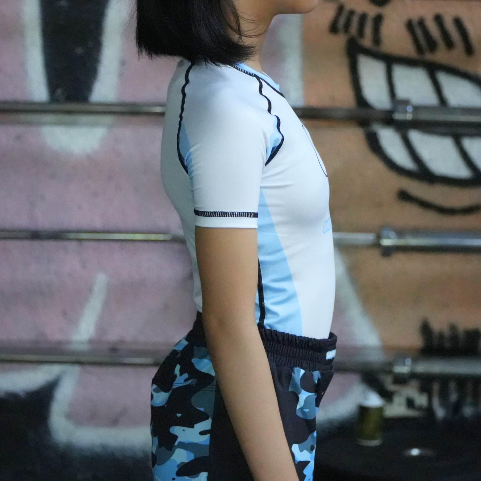 Features reinforced flatlock stitching that reduces chafing and enhances durability under grappling stress. The close-fitting design prevents fabric bunching while allowing unrestricted movement during techniques and sparring.
